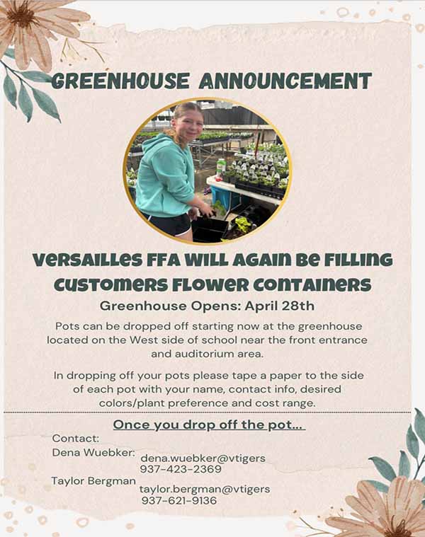 The Versailles Agricultural Education Department and FFA Chapter will be conducting their 15th Annual Greenhouse Sale starting Tuesday, April 28th.