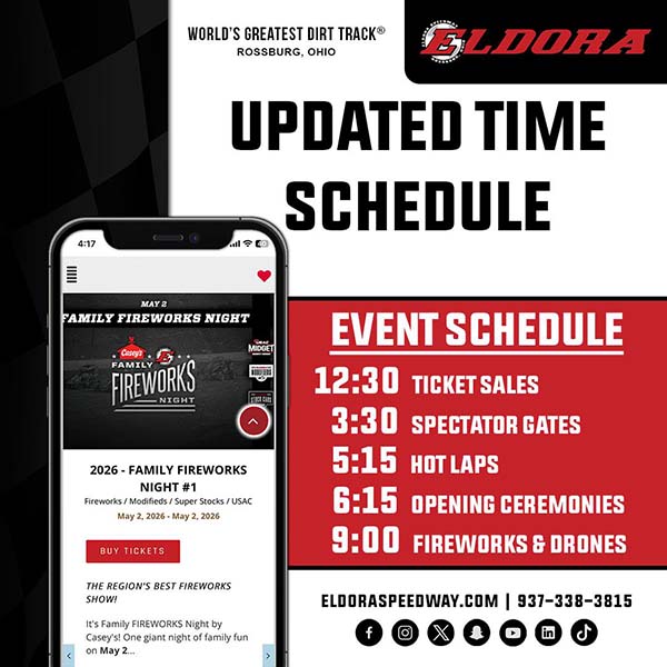 Featured Local Sports UPDATE: Eldora Speedway Family Fireworks Night #1 Staff April 28, 2026 Post navigation Previous: Public Auction – Greenville – 5/2Next: Versailles FFA congratulates new assistant officers